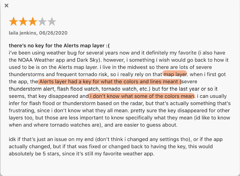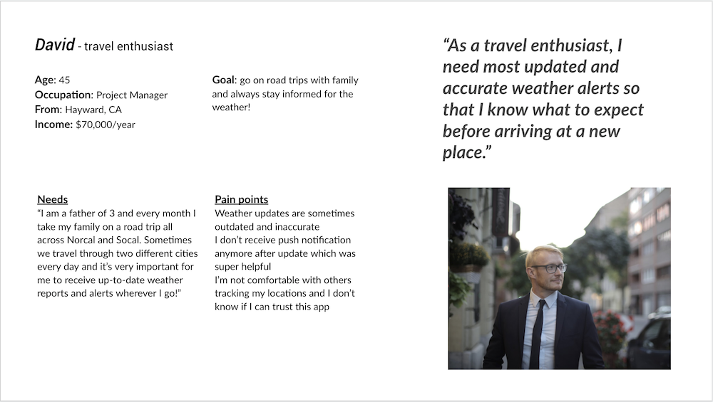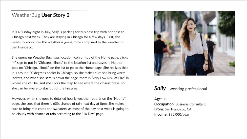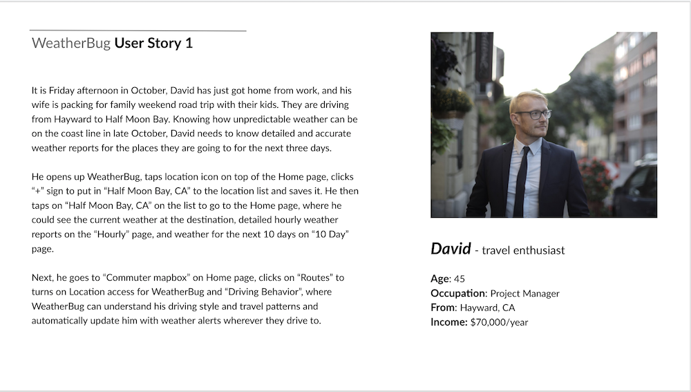 These are three outcomes that users hope to achieve through interacting with WeatherBug. I'm using David's user story as the context.