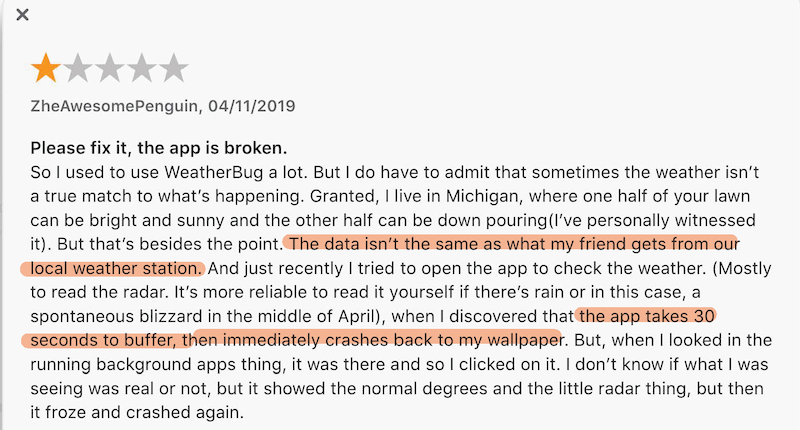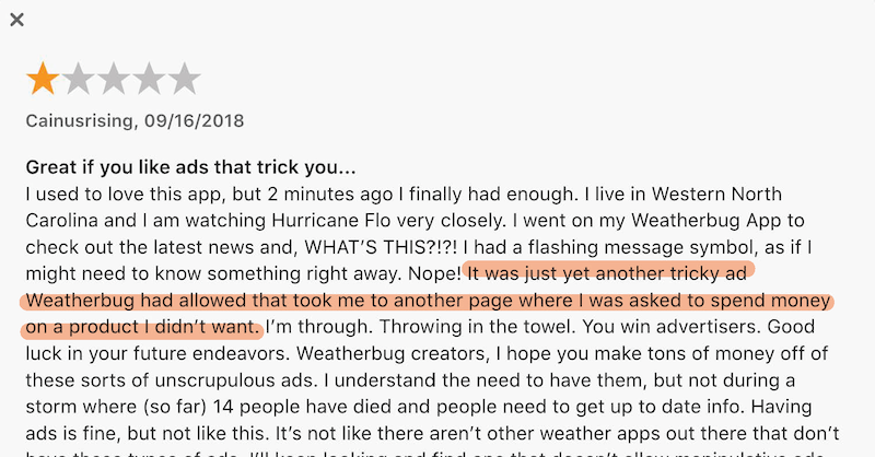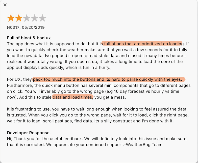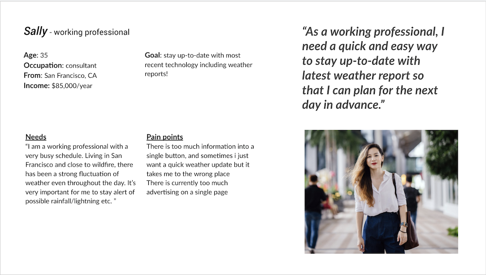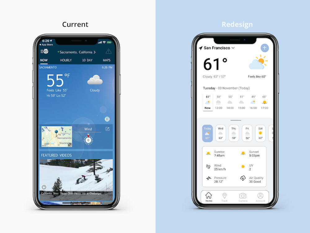 "Current WeatherBug app design doesn’t portrait a feeling or connection with users. Seems like weather reports with random news and advertising."