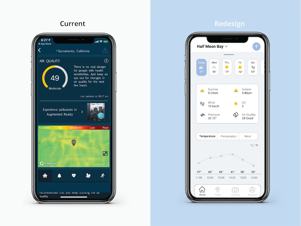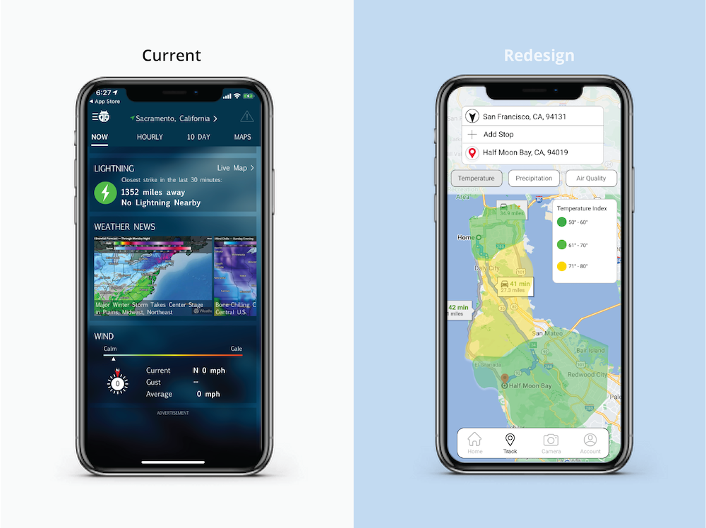 Overview This is a redesign project for WeatherBug, an app that tracks weather conditions from point A to point B, and allows people to share their local weather with friends.